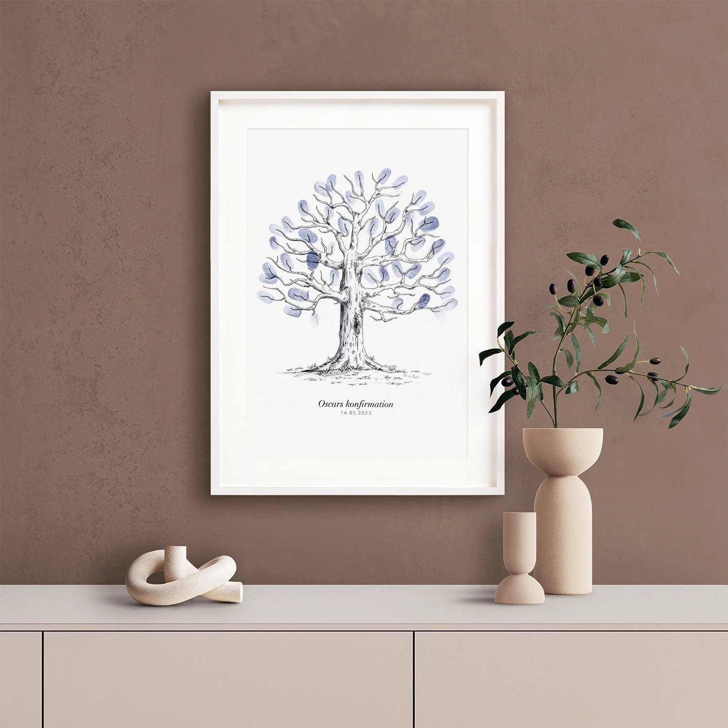 Fingeraftryks plakaten er en sjov og personlig plakat, som du kan tilpasse din særlige begivenhed. Lad alle gæsterne sætte sit eget fingeraftryk som træets blade, og skriv evt. navnet på bladet. Plakaten er et kreativt alternativ eller supplement til en gæstebog.